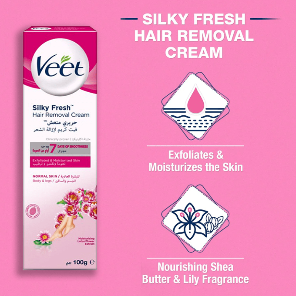 كريم سيلك أند فريش لإزالة الشعر من فيت 100مل :منتج يعمل بالقرب من جذور شعرك ويمنحك بشرة حريرية وناعمة في مدة من 3 إلى 6 دقائق فقطيمكنك استخدام كريم إزالة الشعر على الشعيرات المستعصية في جميع أنحاء الساقين والذراعين والإبطين وغير ذلك الكثيرتركيبة مطورة تمنحك تجربة إزالة شعر مريحة دون ألم في منزلك